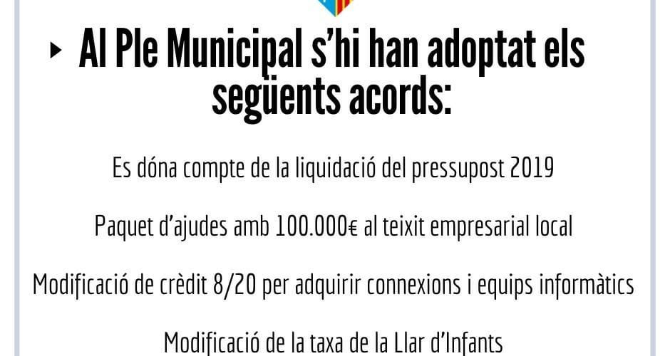El Ple també ha aprovat la modificació de la taxa de la Llar d’Infants pel mes de juliol. En el cas que aquest equipament reobri les portes, els pares i mares podran triar entre dues assistències, les dues primeres setmanes del mes (52€) o tot el mes (104€). El calendari previst donava per finalitzat l’assistència dels infants a la Llar el dia 10 de juliol, però l’equip de govern ha acordat que sigui fins al 31 de juliol, sempre que la Llar torni a donar servei.