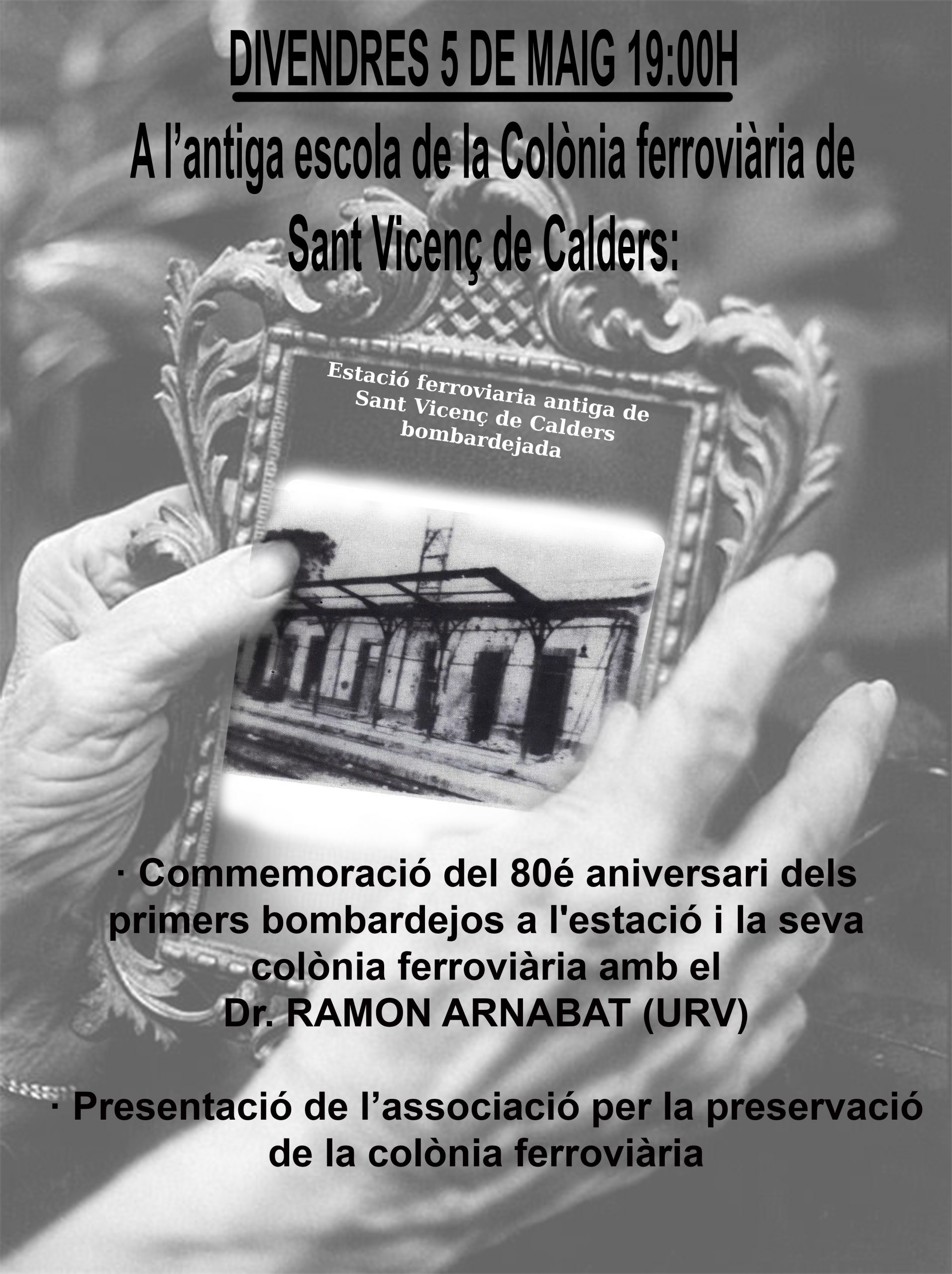 Avui recordem un bonic acte on vam voler unir la il·lusió de la nova associació amb la xerrada realitzada pel professor Ramon Arnabat commemorant el 80è aniversari del primer bombardeig a l’estació de Sant Vicenç de Calders , el 7 de maig de 1937 . Feia goig veure plena de gom a gom l’antiga escola de la colònia ferroviària.