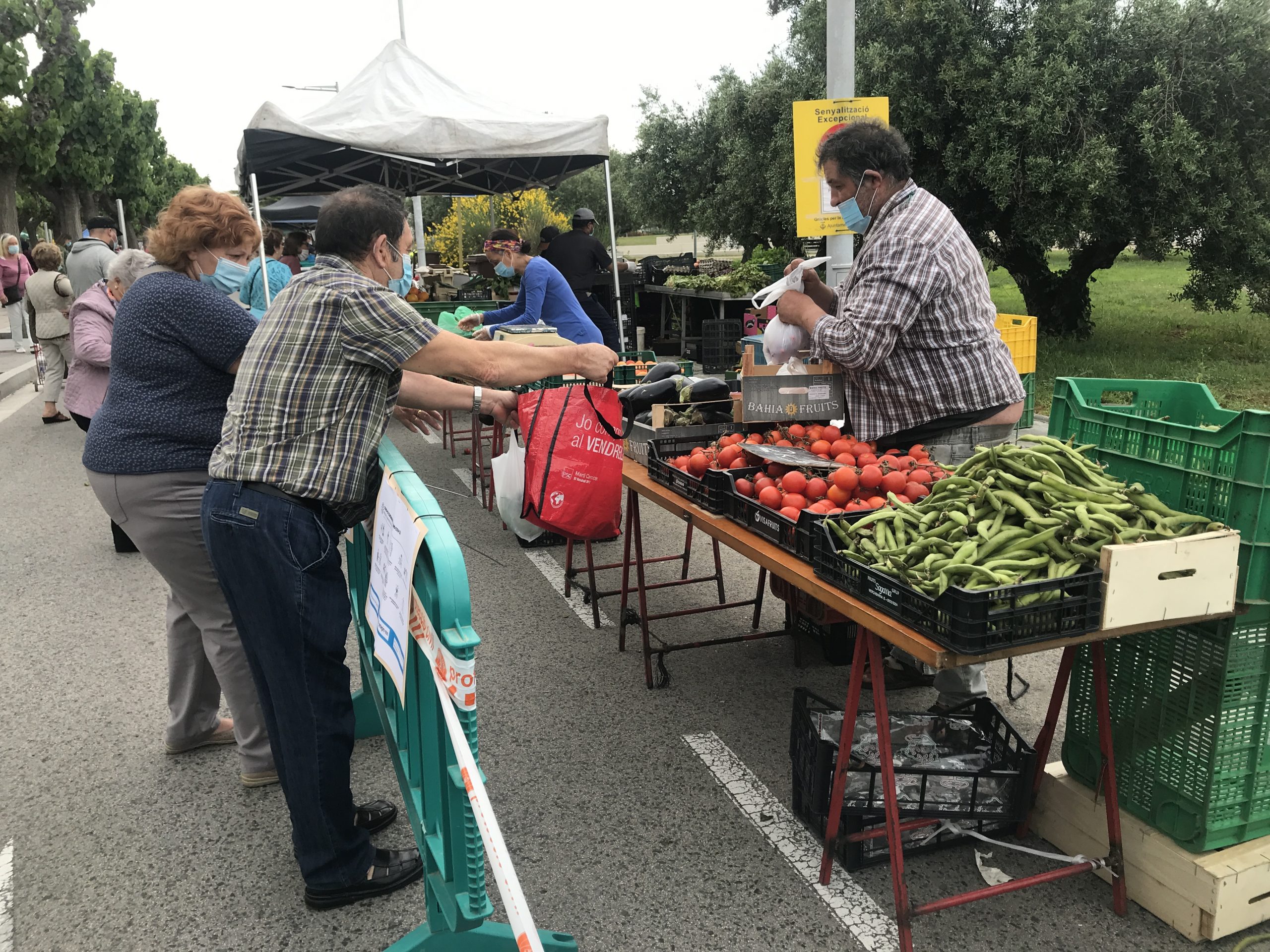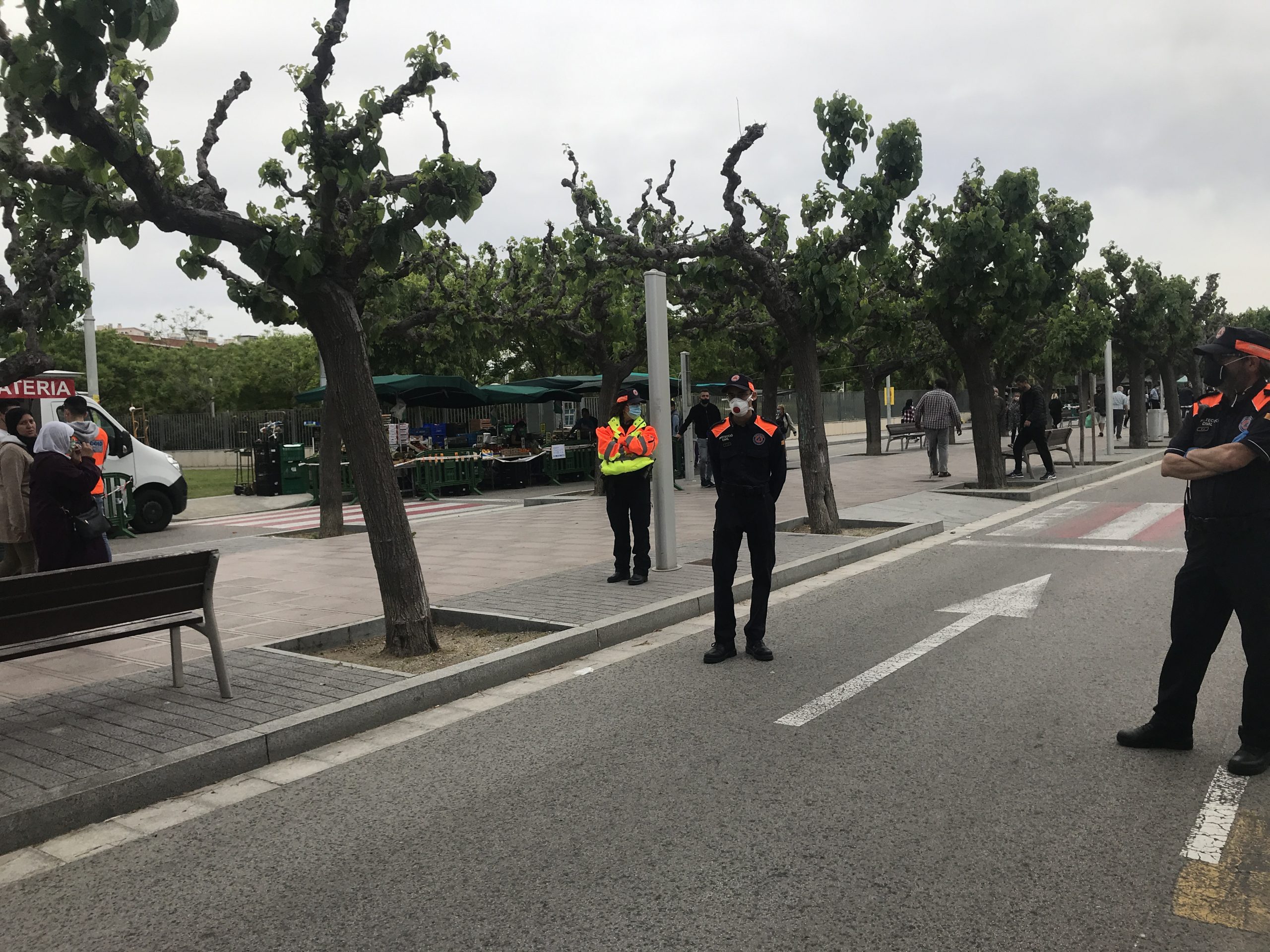 Protecció Civil ha repartit mascaretes i ha col-laborat amb la Policia Local per garantir que es compleixen totes les mesures de seguretat  com la separació entre parades, i també per ajudar a mantenir la distància entre compradors.
