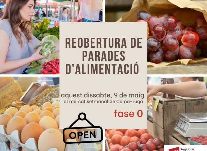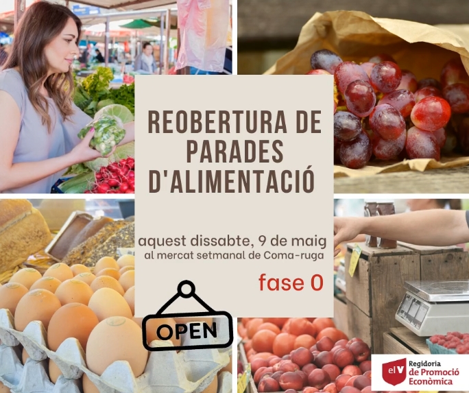 El mercat setmanal de Coma-ruga incorporarà una vintena de paradesel demà, dissabte 16 de maig, a l’Av. Parlament de Catalunya, dins de les accions previstes a la fase 1 de la desescalada del confinament per la Covid-19. Atenent les recomanacions higiènico-sanitàries, s’hi podran trobar parades alimentàries i parades no alimentàries.