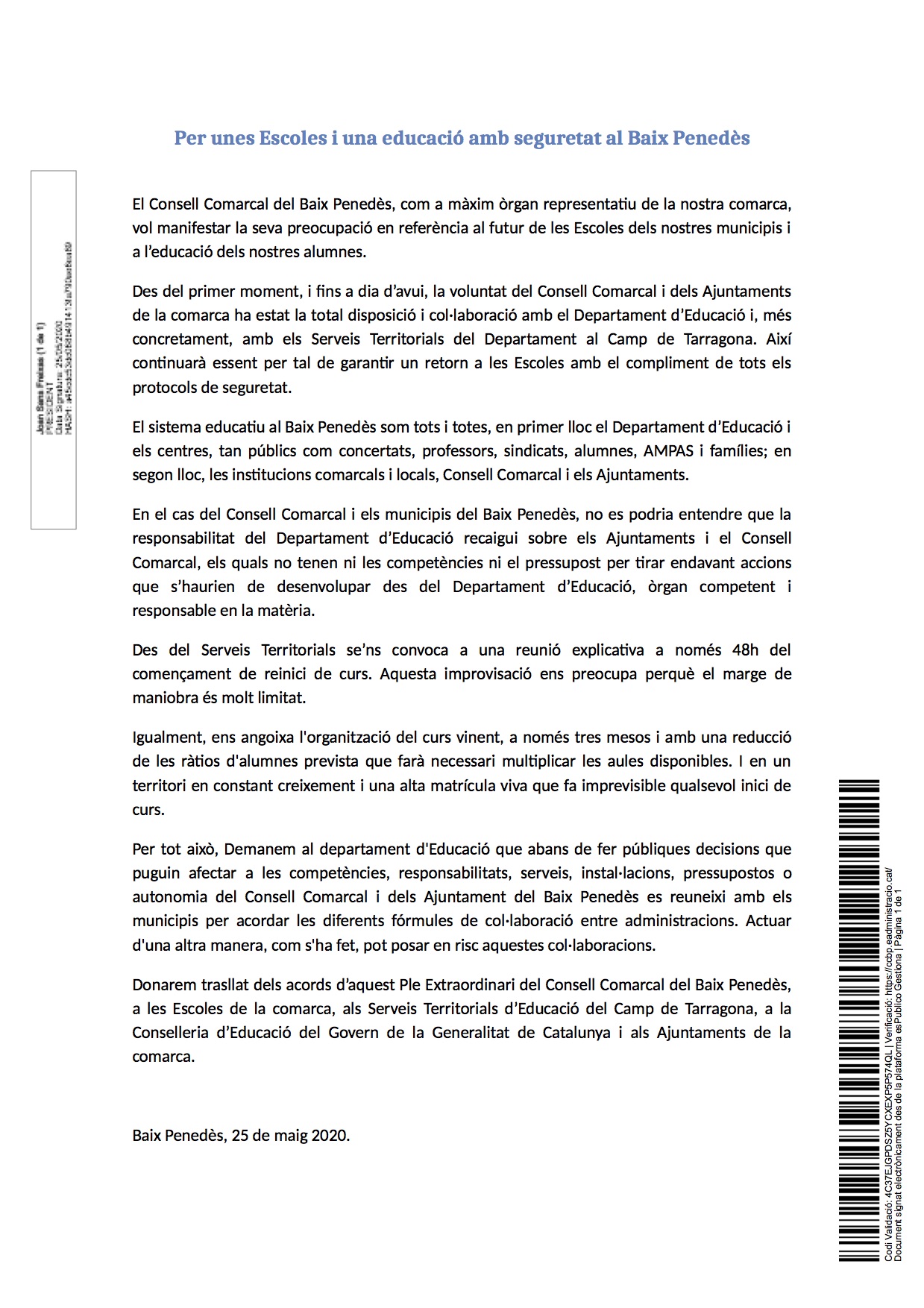 26 de maig de 2020. El Ple del Consell Comarcal del Baix Penedès s’ha reunit d’urgència avui dimarts per debatre sobre les darreres mesures anunciades pel Departament d’Educació de la Generalitat de Catalunya sobre la reobertura de les Escoles. Finalment s’ha aprovat un manifest on demanen que la responsabilitat del Departament d’Educació no recaigui sobre els Ajuntaments i el Consell Comarcal. Hi han votat a favor tots els grups: PSC, Junts, Ciutadans, En Comú Guanyem i PP, excepte ERC que ha votat en contra. La representant d’Alternativa Municipal ha excusat la seva assistència.