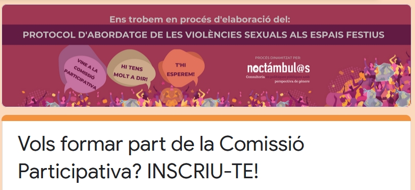 Un del grups de treball fonamentals on s’abordaran i s’identificaran els aspectes a definir en el document final és la Comissió Participativa. A aquest grup de treball hi estan convidades totes aquelles persones del territori que vulguin participar-hi, posant especial èmfasi en aquells col·lectius o persones que tenen implicació i desenvolupen activitats relacionades amb la temàtica, que porten temps treballant des d’una perspectiva de gènere i feminista, o bé que els afecta directament amb les accions que presumiblement es duran a terme per intervenir en els espais festius. La Comissió Participativa recollirà tant informació clau sobre el territori, com aportacions, idees i propostes que vestiran el Protocol que s’està elaborant. A més, aquest grup de treball serà l’encarregat de definir les accions bàsiques del pla d’actuació, tot prioritzant les línies d’actuació que consideri prioritàries al territori.