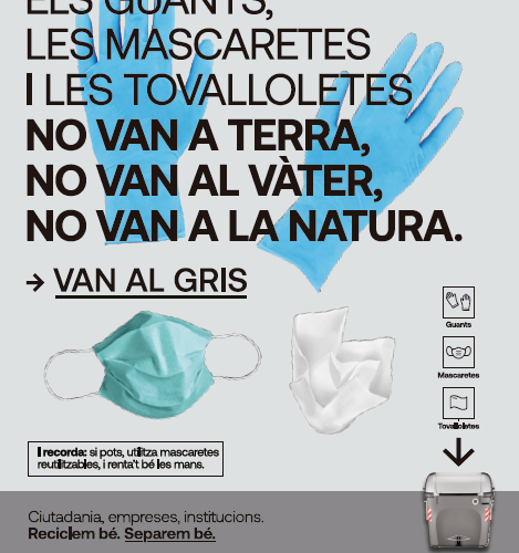 La crisi sanitària ha generalitzat la utilització de mascaretes i guants, un material que la ciutadania no està acostumada a gestionar un cop esdevé residu. És per això que l’Agència de Residus de Catalunya ha considerat oportú adreçar un missatge aclarint-ho. És important saber que els guants que es llencen a terra, a més de generar brutícia, són un risc de contagi per a la població. Pel que fa a les tovalloletes humides, si es llencen al vàter embussen canonades i generen grans sobrecostos en el sanejament d’aigües residuals.