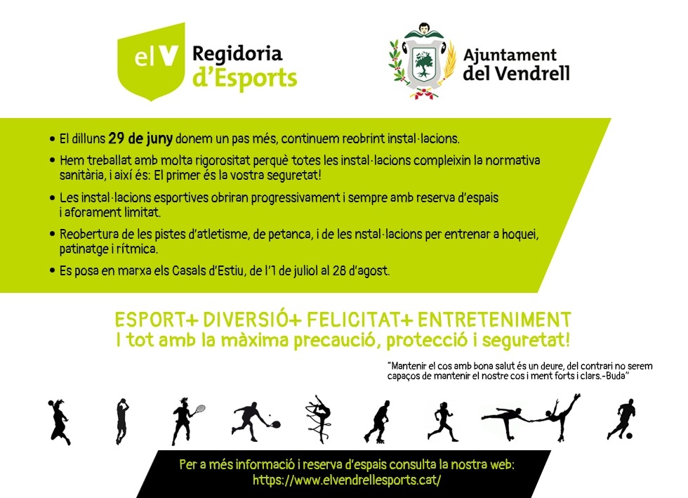 Així mateix, es podrà fer ús de la pista Cruyff Court i les pistes esportives exteriors. Sempre recordant als vendrellencs i vendrellenques la necessitat de ser prudents i fer servir les mesures d’autoprotecció.