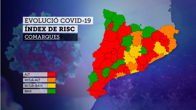 Al conjunt de Catalunya, el risc de rebrot es manté a la franja alta i només baixa un punt. Si fa uns dies el vermell estava centrat en Barcelona, les àrees metropolitanes i el Segrià, ara la taca de risc molt alt està més estesa, amb comarques interiors de Girona, a més de les del Camp de Tarragona.