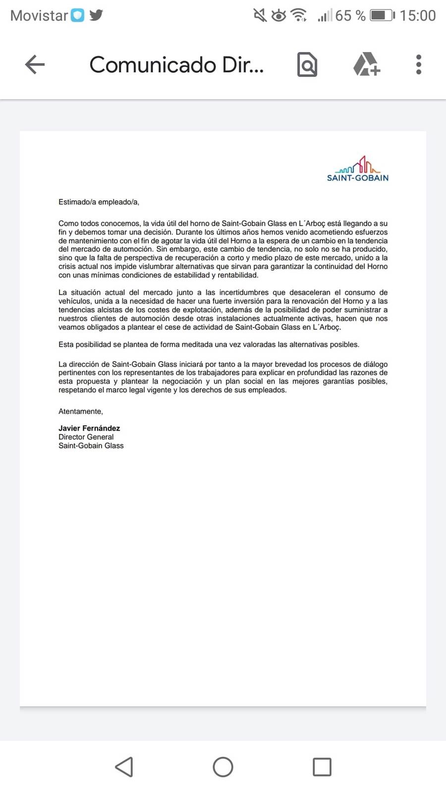 En una carta adreçada als treballadors la cristalera situada a l´Arboç Saint Gonbain Glass , podria tancar definitivament.