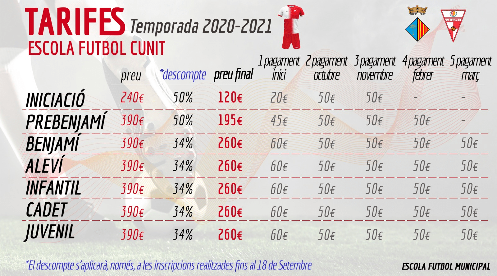 🗣️ _*Continua obert el període d’inscripció de l’Escola de Futbol de Cunit,*_ que aquest estiu ha començat a treballar en un conveni de col·laboració amb la regidoria d’Esports de l’Ajuntament. Per a realitzar consultes i inscripcions, l’horari d’atenció és els dimarts i dijous de 18:30h a 20h, al Camp de futbol.