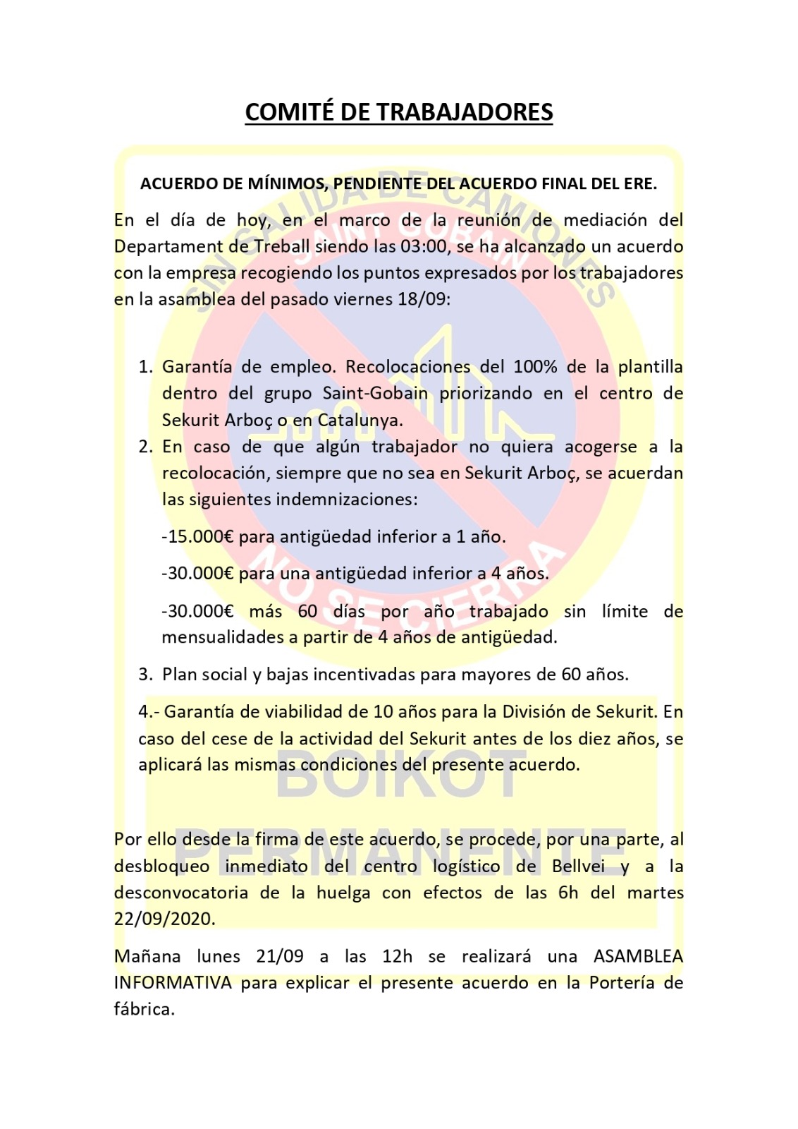 En el dia d’avui, en el marc de la reunió de mediació del Departament de treball sent les 3.00 am, s’ha aconseguit un acord amb l’empresa recollint els punts expressats pels treballadors en l’assemblea del passat divendres 18/09: