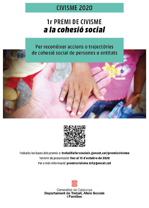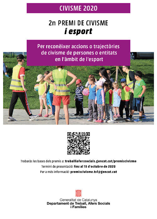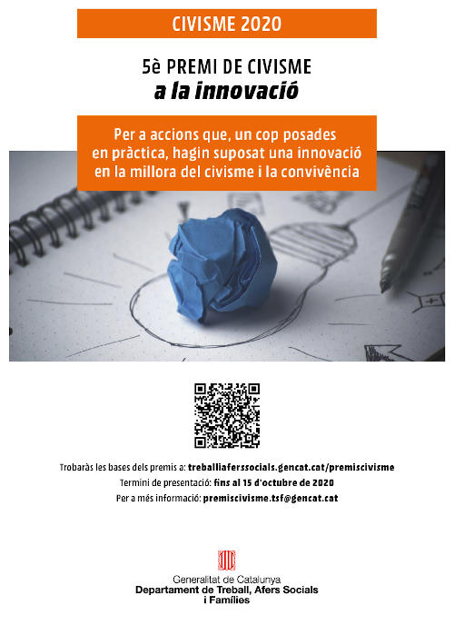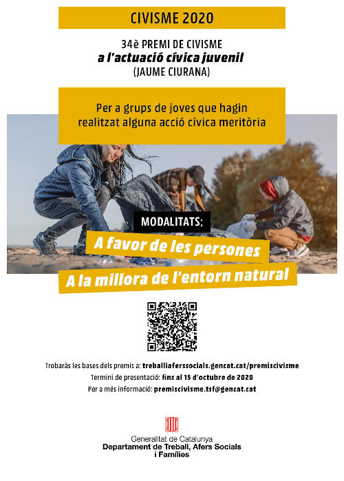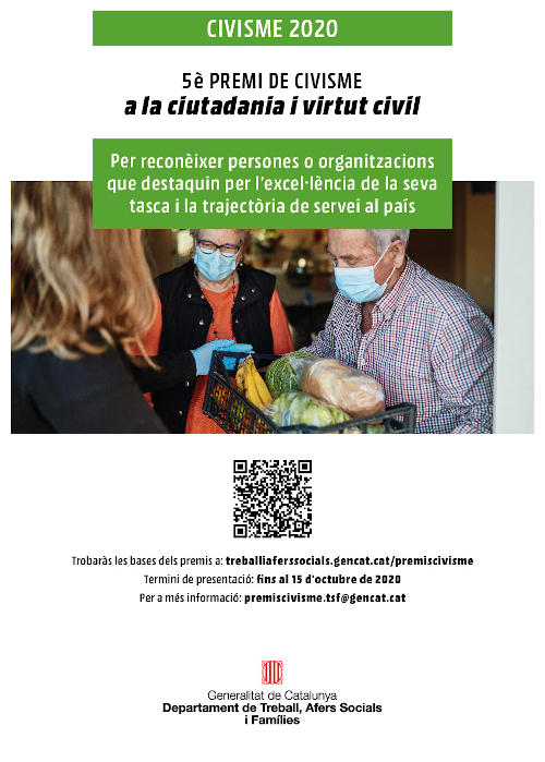 El Departament de Treball, Afers Socials i Famílies manté oberta la convocatòria dels Premis Civisme 2020 fins al 15 d’octubre. La Direcció General d’Acció Cívica i Comunitària impulsa aquests guardons amb l’objectiu d’estimular, des d’àmbits i edats ben diferents, reflexions sobre el civisme i actuacions de millora en l’entorn.