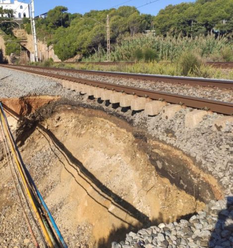Adif preveu tenir enllestida al llarg del matí de dimecres la reparació de l’esvoranc a la plataforma ferroviària malmesa entre Vilanova i la Geltrú i Sitges a causa dels aiguats del passat cap de setmana. La incidència ha obligat a tots els trens a circular per via única, fet que ha afectat al servei ordinari de la línia R2 Sud de Rodalies, que ha hagut de reduir les freqüències de pas per estacions com la de Cubelles.