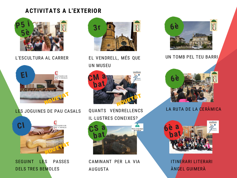 A més a més, aquest curs s’han volgut potenciar les activitats d’exterior, per això els equipaments culturals presenten un seguit d’itineraris per als diferents nivells escolars per conèixer més de prop el patrimoni vendrellenc.