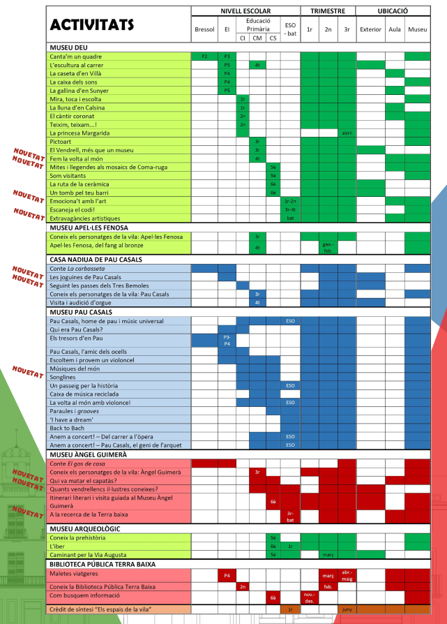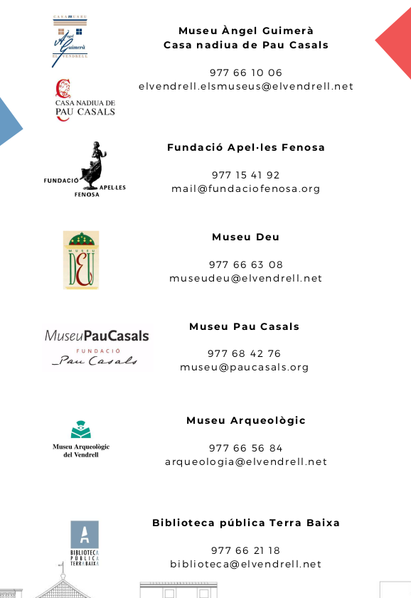 Com cada any, des de la Regidoria de Cultura de l’Ajuntament del Vendrell presenten el programa general de les activitats educatives dels equipaments culturals de la vila: el Museu Deu, el Museu Apel·les Fenosa, el Museu Arqueològic, la Casa nadiua de Pau Casals, el Museu Pau Casals, el Museu Àngel Guimerà i la Biblioteca pública Terra  Baixa per al curs 2020 – 2021.