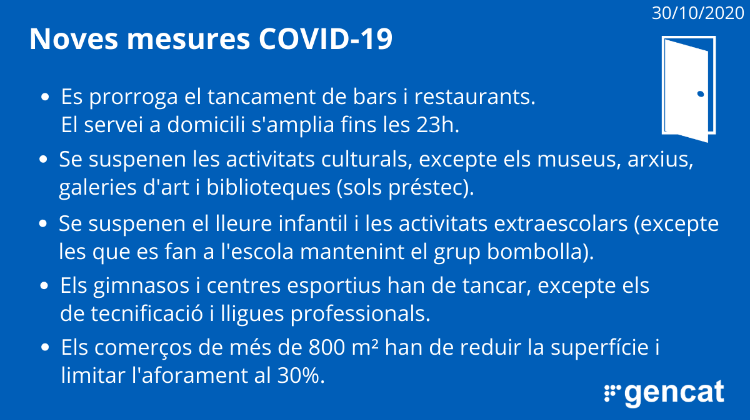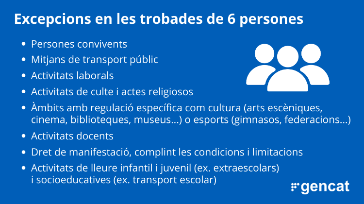 - Prohibició de fer reunions de més de 6 persones, tant en l’àmbit públic com en el privat.