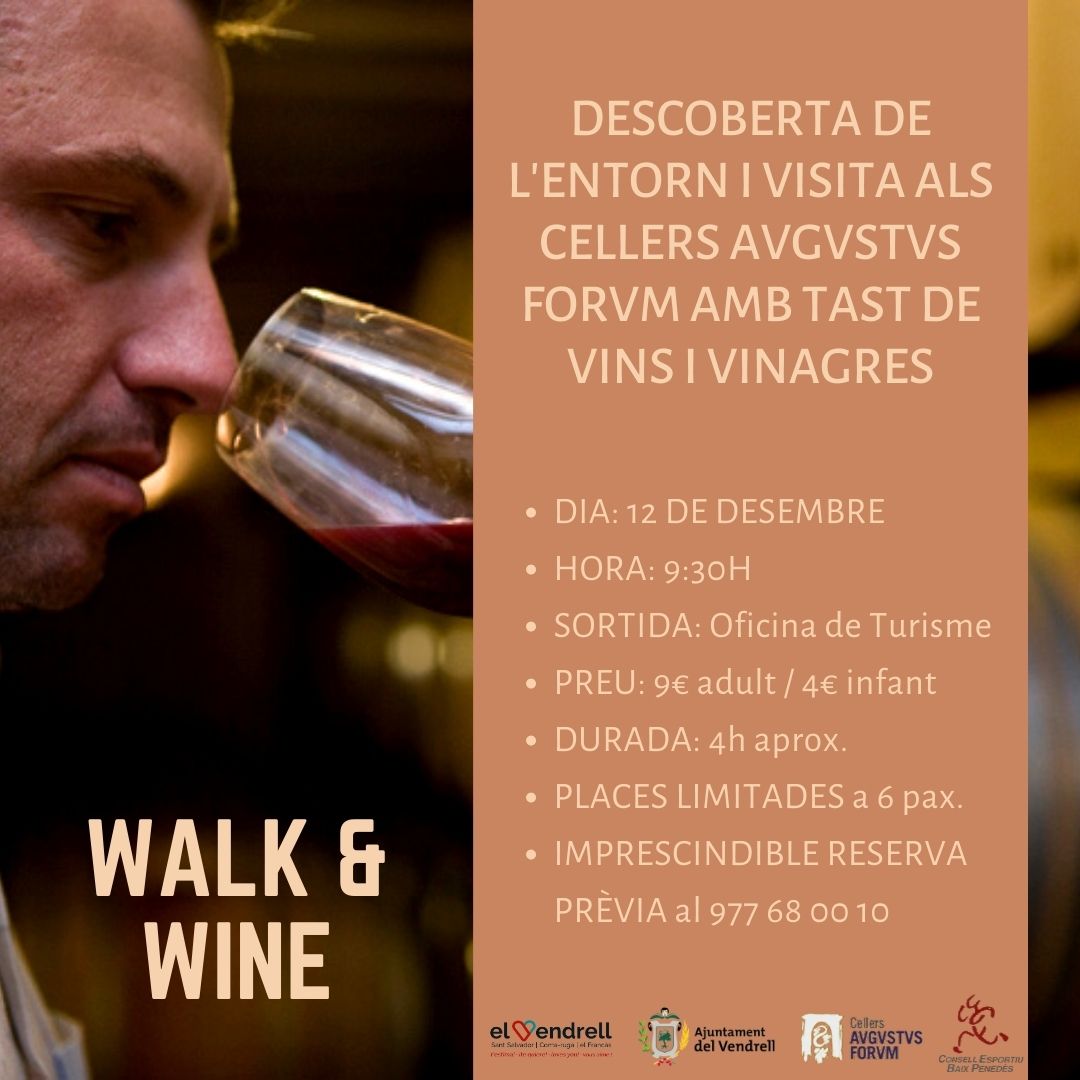 I el dissabte 12 de desembre hi ha programada una sortida Walk & Wine amb descoberta de l’entorn i visita als Cellers Avgvstvs amb degustació de vins i vinagres. La sortida tindrà lloc a les 9:30 h des de l’Oficina de Turisme. El preu de l’activitat és de 9 euros per als adults i de 4 euros per als infants. Les places són limitades a 6 persones i cal fer reserva prèvia al telèfon 977 68 00 10.