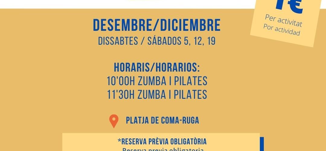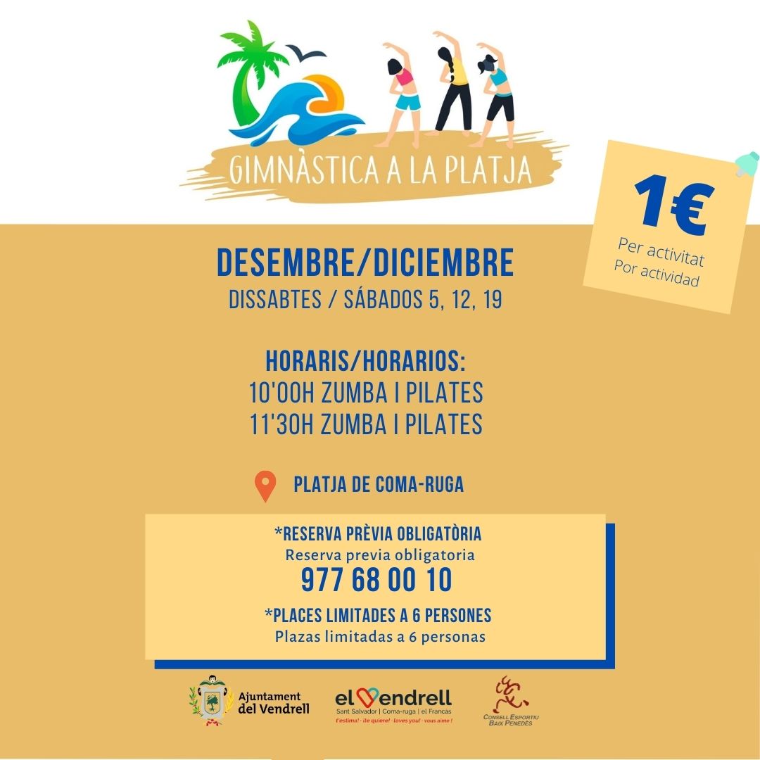 La gimnàstica a la platja es farà els dissabtes 5, 12 i 19 de desembre, a les 10 h i a les 11:30 h, i es podrà escollir entre Zumba i Pilates. Cal fer reserva prèvia al telèfon 977 68 00 10 i fer el pagament anticipat d’1 euro a l’Oficina de Turisme. Les places són limitades a 6 persones.