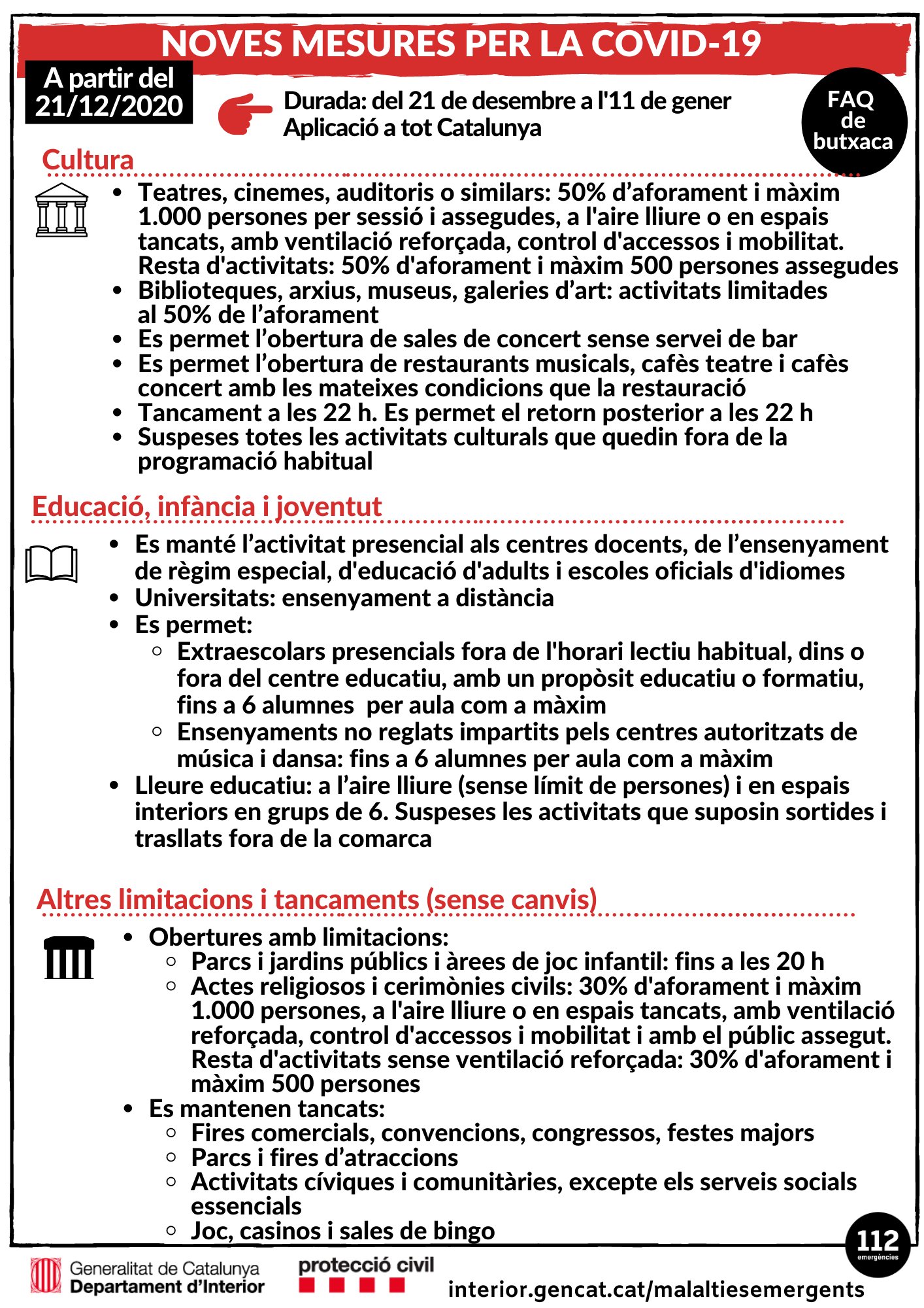 El Govern de la Generalitat de Catalunya ha fet públiques les restriccions que estaran en vigents fins el proper 11 de gener de 2021 i que començaran a aplicar-se en tot el territori català el pròxim dilluns 21 de desembre.