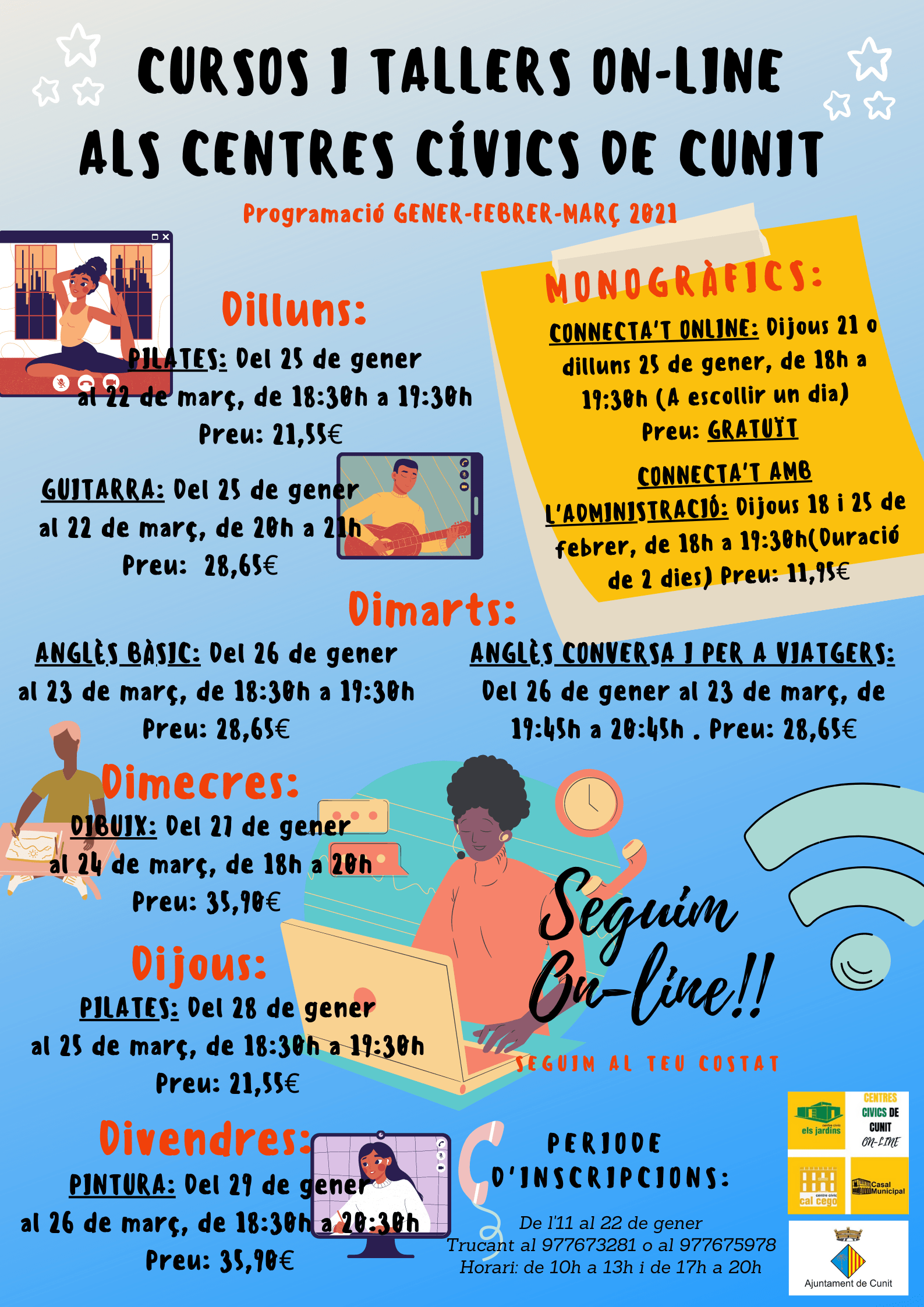 Es reprén el curs escolar i comença també un nou trimestre als Centres Cívics de Cunit, oferint una programació online de tallers i activitats fins al mes de març.