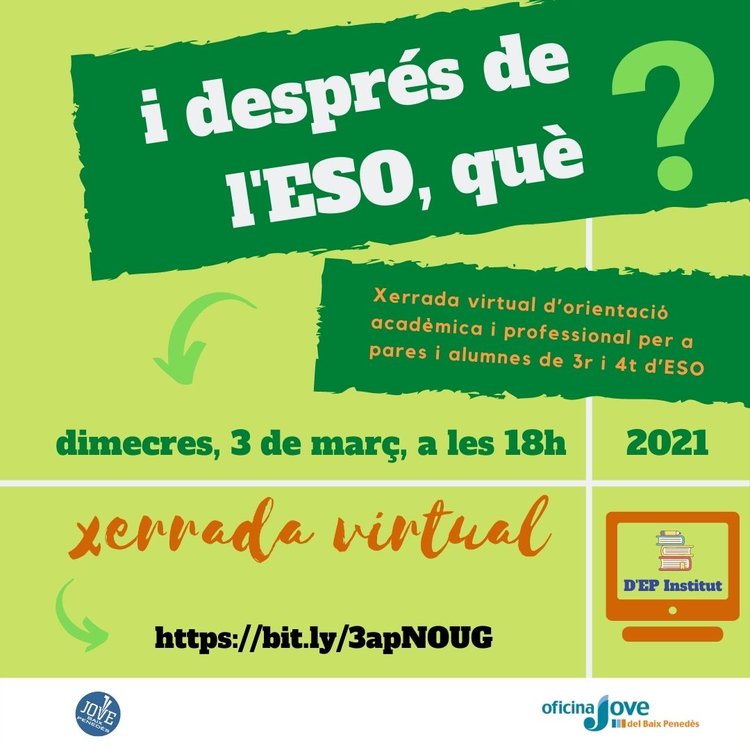 L’Oficina Jove Baix Penedès organitza una xerrada virtual d’orientació acadèmica i professional, amb la finalitat que els pares i alumnes de 3r i 4t d’ESO coneguin totes les opcions formatives i laborals amb o sense graduat en ESO. Aquesta activitat està pensada com un espai de trobada on els joves i les seves famílies rebran orientació i informació acadèmica i professional.