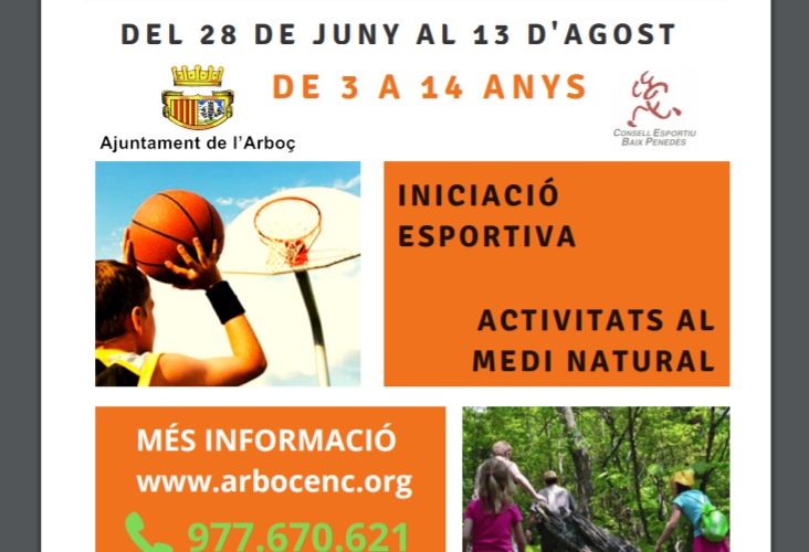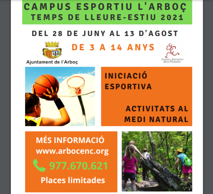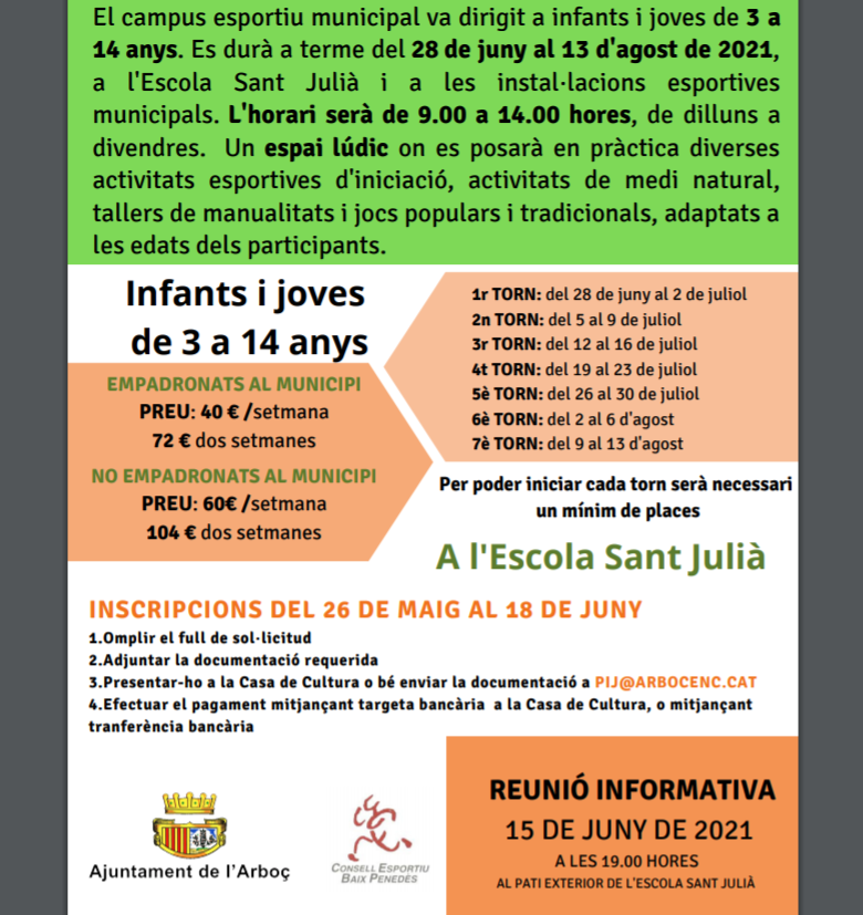 L’Ajuntament de l’Arboç organitza novament per aquest estiu un Campus Esportiu Municipal amb activitats esportives d’iniciació, activitats de medi natural i tallers de manualitats dirigit a nens i nenes de 3 a 14 anys. El preu de l’inscripció serà de 40€ la setmana i 72€ dues setmanes pels nens i nenes de l’Arboç i 60€ i 104€ pels nens i nenes de fora de l’Arboç. Les places seran limitades i es complirà amb tota la normativa sanitària contra la Covid-19. El període per inscriure’s s’iniciarà el proper 26 de maig i finalitzarà el 18 de juny. El dia 15 de juny a les 19:00h es farà una reunió amb els pares per explicar el funcionament del campus i totes les mesures de seguretat i higiene que es seguiran.