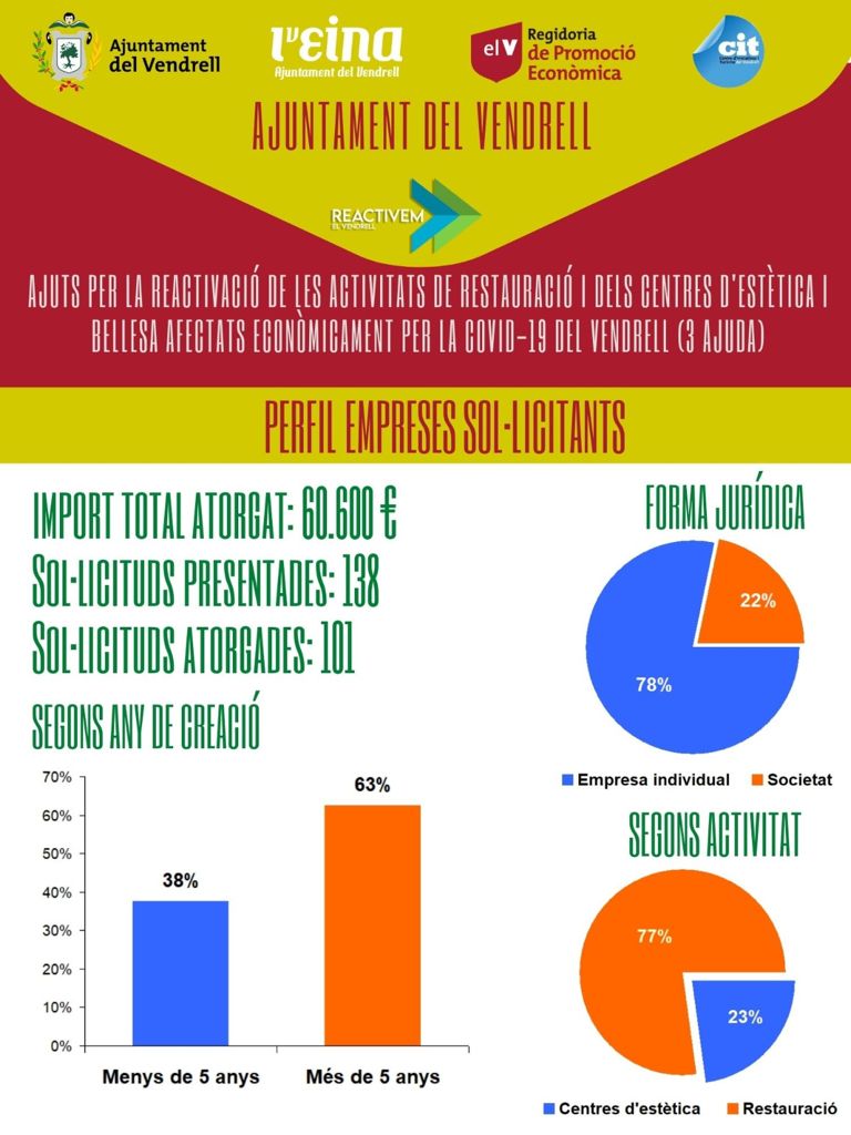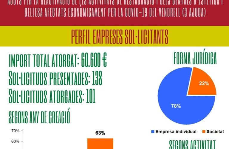 S’han concedit 101 ajuts per al total de 138 sol·licituds presentades, amb una aportació de 60.600 euros per a tots ells; 600 euros per a cadascú dels beneficiaris. El 77% dels beneficiaris són bars i restaurants i un 23% centres d’estètica; el 63% són empreses de més de cinc anys d’antiguitat i el 78% corresponen a autònoms.