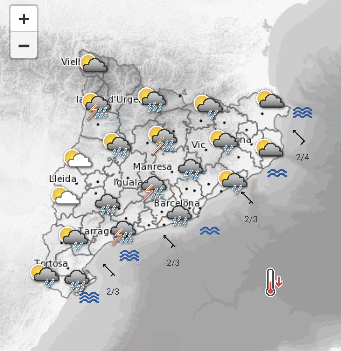 El *Servei *Meteorològic de Catalunya (*SMC) ha alertat de fortes precipitacions que s’esperen per a última hora de la tarda. Els pronòstics afirmen que les pluges entraran a partir de les 18.00 hores per la província de Tarragona i que amb el pas de les hores s’acostaran a Barcelona. El temporal creuarà tota Catalunya entre avui i demà fins que finalment sortirà per Girona.