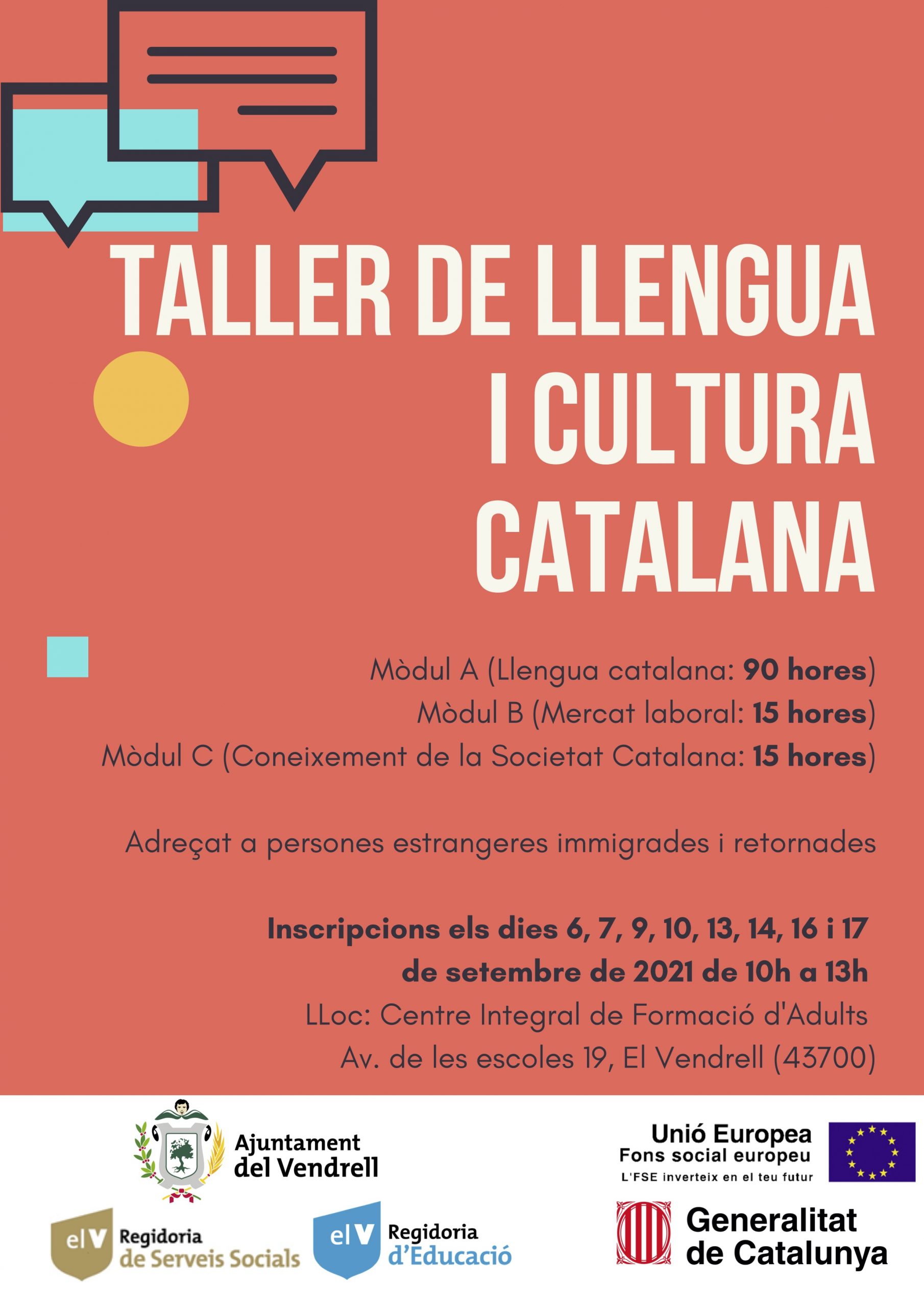 Les inscripcions es faran els dies 6, 7, 9, 10, 13, 14, 16 i 17 de setembre de 2021, de 10 a 13 hores, al Centre Integral de Formació d’Adults (Avinguda de les Escoles número 19 del Vendrell).