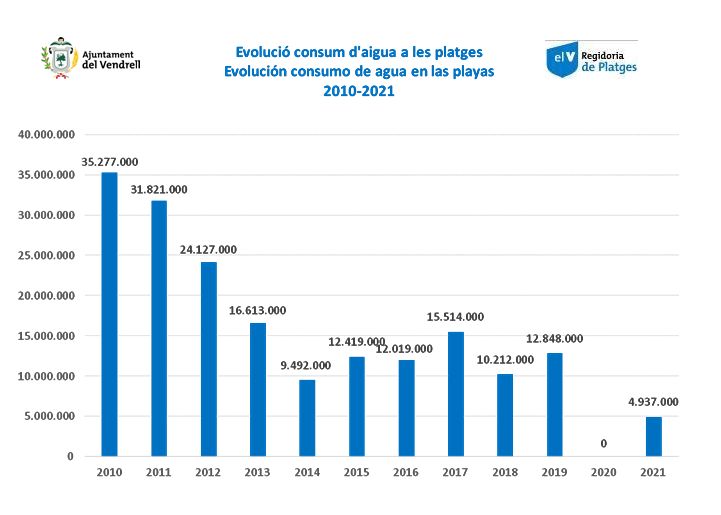Aquest 2021 vam fer un pas més i es va suprimir l’ús de dutxes deixant només els assortidors de llavapeus. Amb aquesta mesura hem passat del consum de 2019 de 12.848.000 litres a 4.937.000 litres, entre tots en només 4 mesos hem estalviat gairebé 8.000.000 de litres d’aigua, la qual cosa suposar que s’ha consumit un 38% i s’ha estalviat un 62% respecte el 2019.