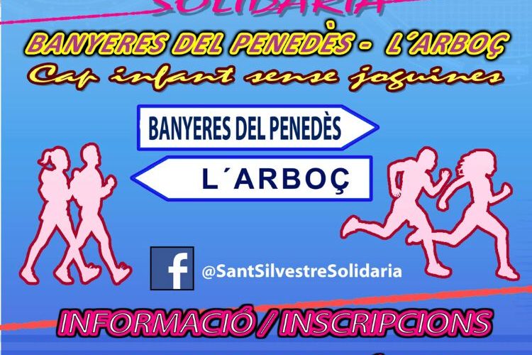 El divendres 31 de desembre tindrà lloc la 4ª Sant Silvestre Solidària- cap infant sense joguines! Serà una cursa competitiva i també una caminada solidària de 5 km. En aquesta edició, la sortida serà des de la Plaça de l’Ajuntament de Banyeres del Penedès i l’arribada serà al Poliesportiu Municipal de l’Arboç situat a la Plaça Catalunya.