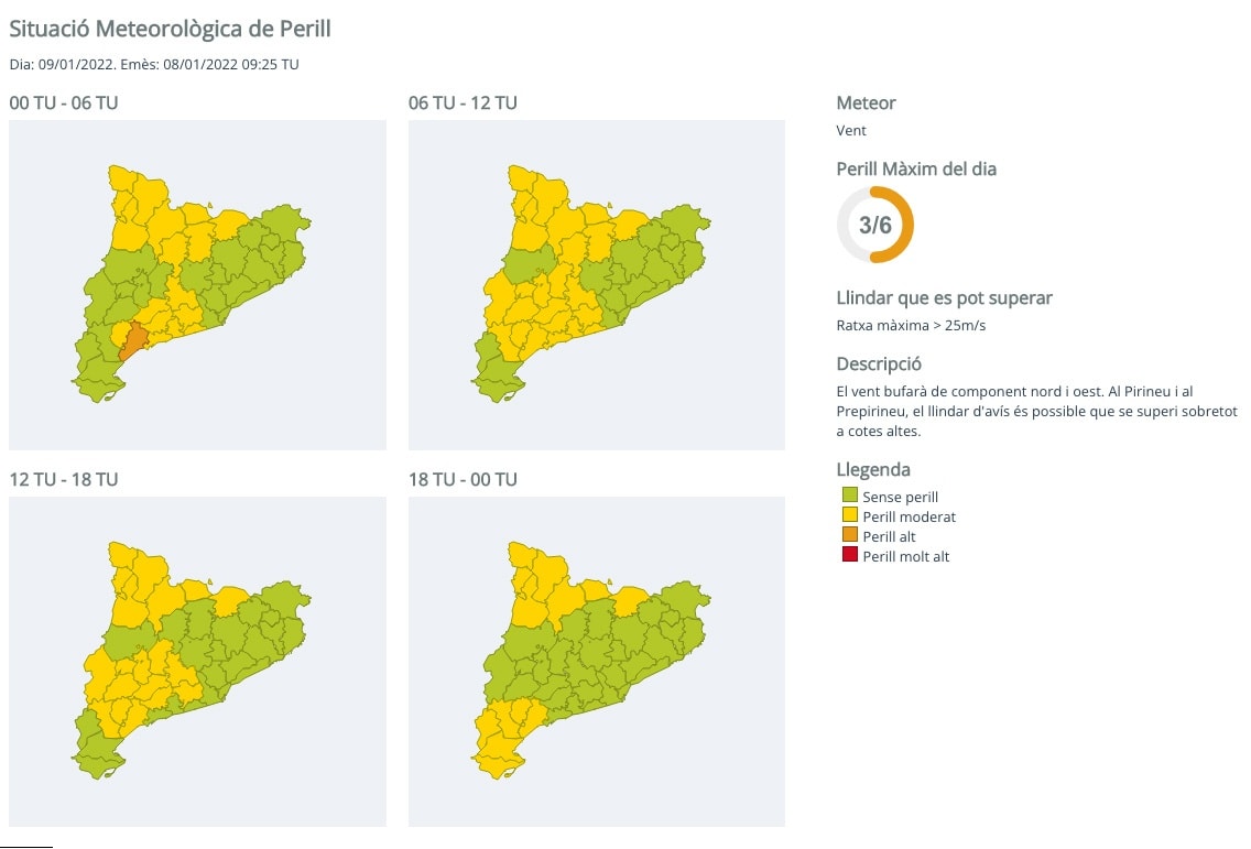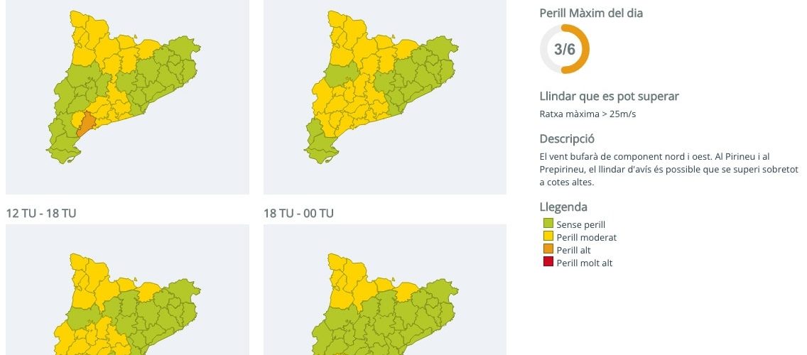 Davant d’aquesta previsió, Protecció Civil de la Generalitat ha posat en alerta el pla especial d’emergències per risc de vent a Catalunya (Ventcat) i el pla especial d’emergències per nevades a Catalunya (Neucat). Les ratxes seran especialment fortes al Baix Camp demà diumenge i de cara a dilluns es concentraran als Pirineus i a les Terres de l’Ebre, amb cops de més de 72 quilòmetres per hora.