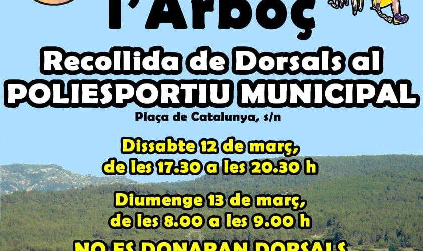La recollida de dorsals es farà al Poliesportiu Municipal el dissabte de 17:30h a 20:30h i el mateix diumenge de 8h a 9h del matí