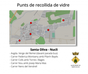 S’informa que la recollida de vidre es manté en 12 punts fixes distribuïts estratègicament a la via pública per optimitzar-ne la seva recollida i evitar que es converteixin en punts conflictius. Per això alguns punts de recollida de vidre s’han reubicat en un altre lloc. Podeu consultar el plànol que us adjuntem amb tots els punts de recollida de vidre.