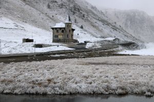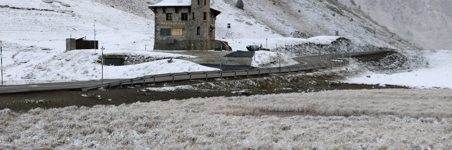 Pla general del cap del Port de la Bonaigua el 3 de novembre del 2021 emblanquinat per la darrera nevada.
