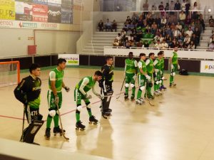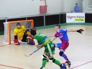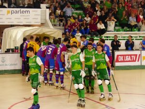 Partit de hoquei entre el Calafell i el Barcelona i presentació de la copa al públic, fotos. Públic. Gol del Calafell. I passadís als campions. Calafell 1 Barcelona 3