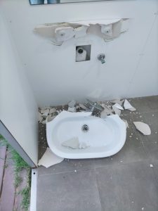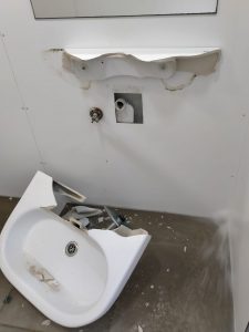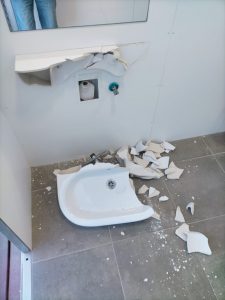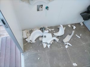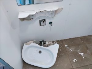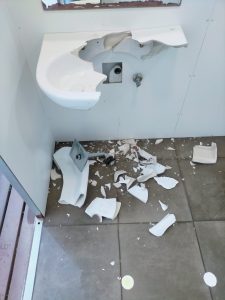 Així s’han trobat avui tots els serveis i banys públics al passeig Marítim de Calafell. Les destrosses son considerables per robar el material de les aixetes i tuberies
