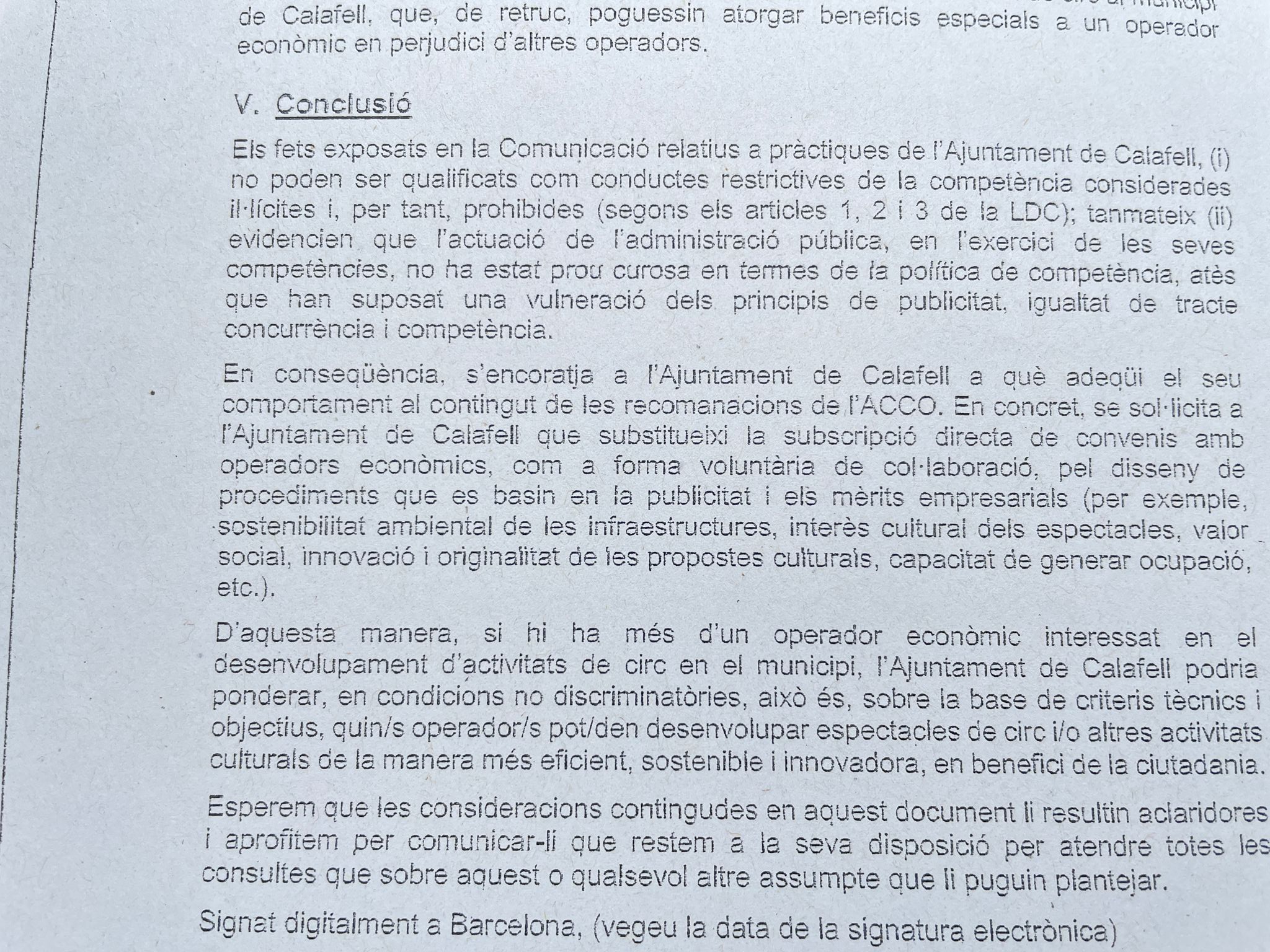 En aquest sentit, exposen un informe de l’Autoritat Catalana de la Competència en què es conclou que l’Ajuntament ha actuat de forma legal però ho ha estat “prou curós” en els principis de publicitat, igualtat de tracte concurrència i competència. L’ACCO insta el consistori a substituir els convenis directes per procediments basats en la publicitat i els concursos de mèrits empresarials per tal de poder triar en base a la millor proposta.