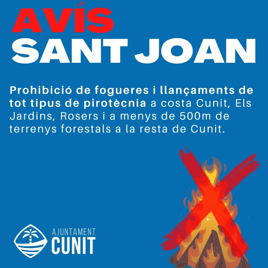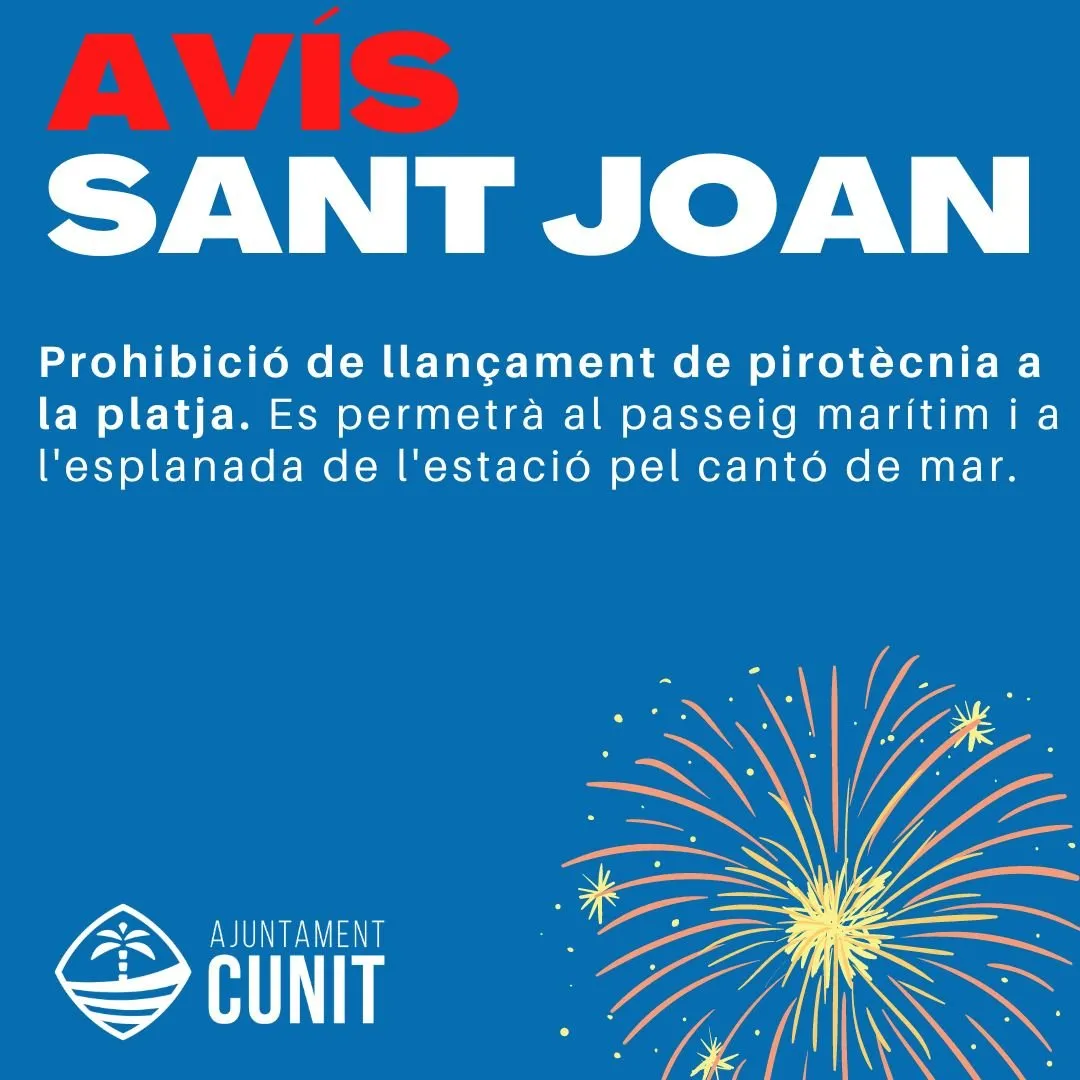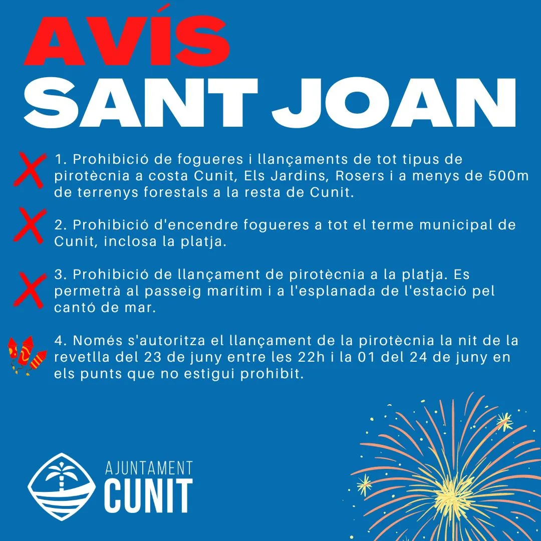Atesa la situació exepcional de sequera, de l’estat de la vegetació i per es altes temperatures previstes per aquesta revetlla, l’ajuntament de Cunit limita els llocs on es poden disparar cohets i altra pirotècnia la nit de Sant Joan. Com a novetat, l’ajuntament habilita el solar comprès entre l’av Tarragona, l’Av de la Font i el carrer de l’Estació.