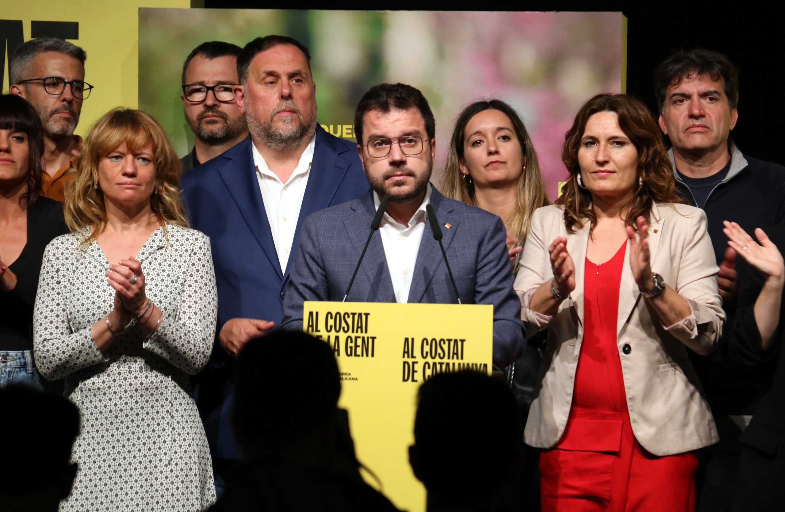 Aragonès ha comparegut sol a l’escenari de la sala de premsa de Calàbria. Al darrere de la sala, però, hi havia Junqueras, a més de la portaveu i adjunta a la secretaria general, Marta Vilalta; la portaveu a Madrid, Teresa Jordà; la cap de llista a les europees, Diana Riba; el president del grup parlamentari, Josep Maria Jové; la portaveu del partit, Raquel Sans; entre d’altres dirigents d’ERC.